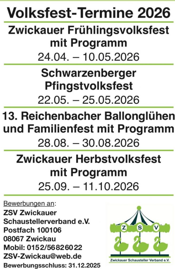 Das Herbstvolksfest in Zwickau findet vom 25.09.2026 bis zum 11.10.2026 auf dem Platz der Völkerfreundschaft, im Herzen der Stadt, statt.